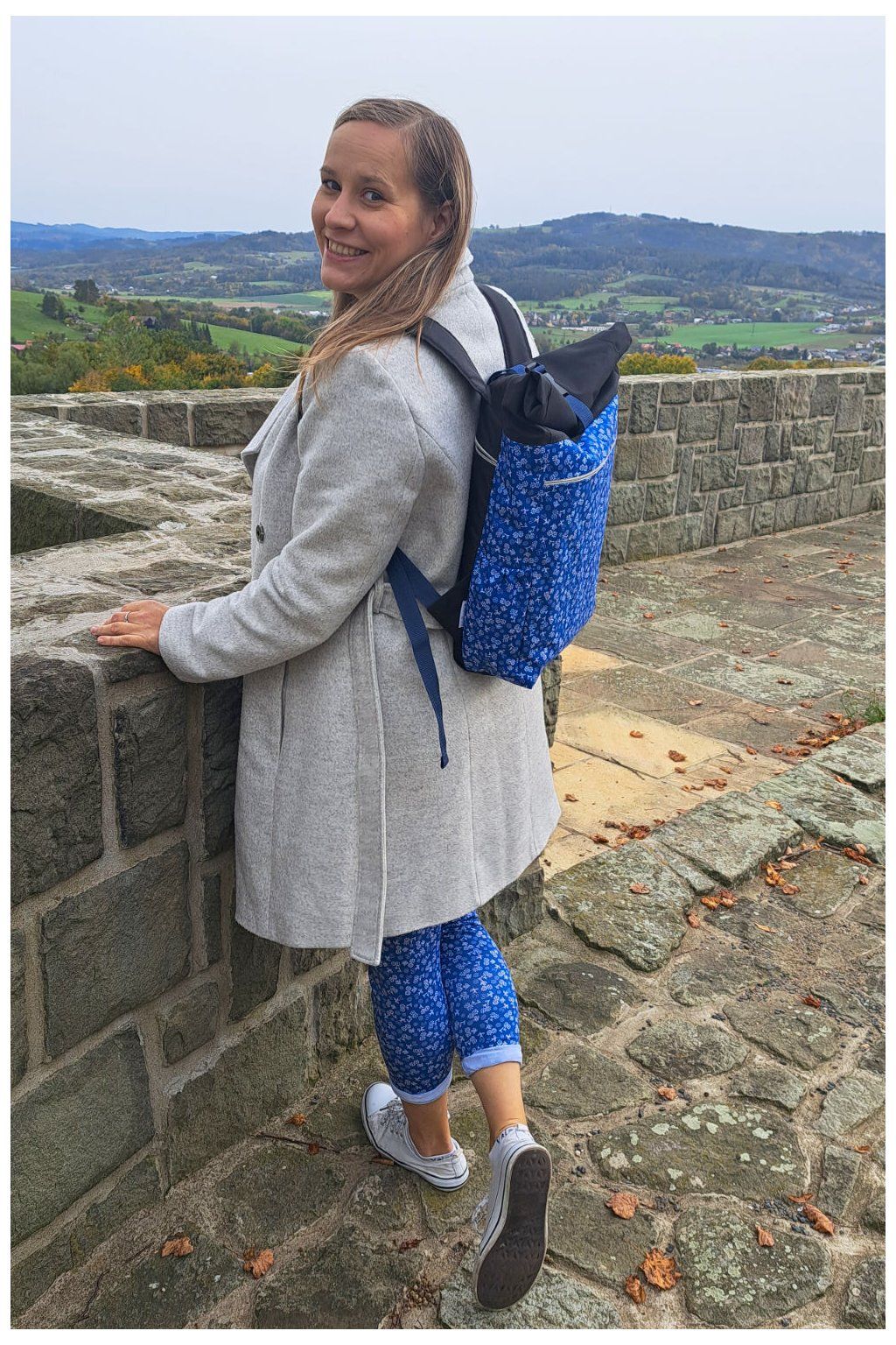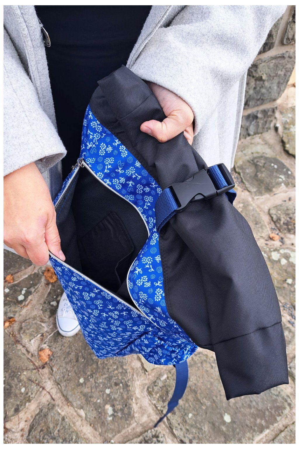 Roll Up batoh Rozmarýnka – modrý podklad, bílý motiv
